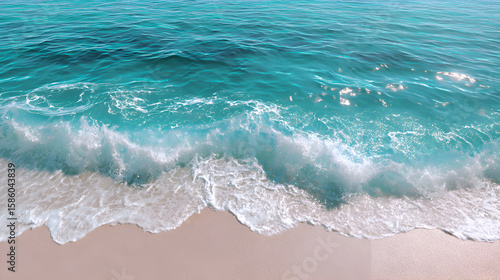 Crystal-clear turquoise waves gently crashing on a soft sandy beach under bright daylight. Serene tropical seascape.