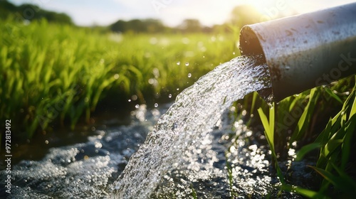 crystalclear water gushing from large metal pipe in lush green field closeup shot emphasizing waters purity and force with sunlight glinting off droplets