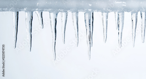 Crystalline icicles dangling from snowy surface, varying in size and form, presenting stark winter landscape with pristine white background and generous negative space