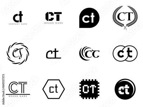 CT logo company template. Letter c and t logotype. Set different classic serif lettering and modern bold text with design elements. Initial font typography.