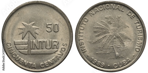 Cuba Cuban coin 50 fifty centavos 1989, for visitors/tourists only, INTUR emblem, palm tree near sea, date below,