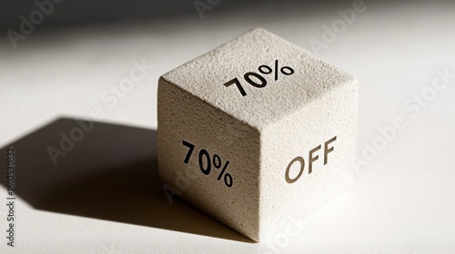 Cube with 70% OFF promo text on textured stone
