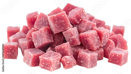 Cubed, pinkish-red meat, piled high