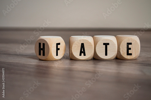 Cubes and dice with the opposite of hate and fate on wooden background