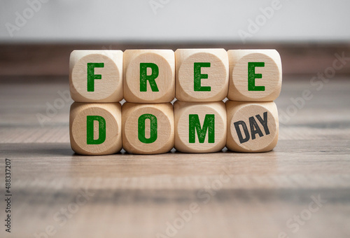 Cubes, dice or blocks with freedom day - metaphor for end of pandemic and endemic on wooden background