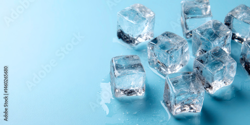 Cubes of clear ice on light blue background, flat lay. Space for text