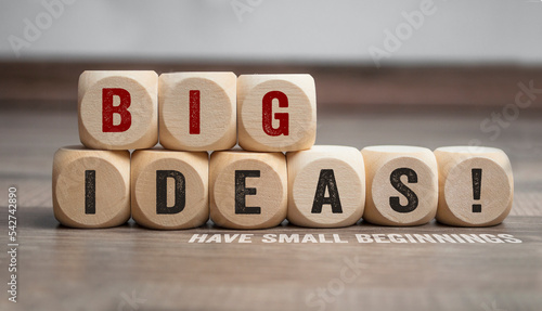 Cubes or dice with big ideas have small beginnings on wooden background