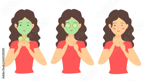 Cucumber mask. Facial skin care procedure. Cosmetics. Set. Girl. Vector illustration