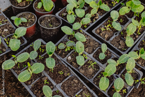 Cucumber seedlings sprout. Young fresh seedling stands in plastic pots. cucumber plantation. cultivation of cucumbers in greenhouse.