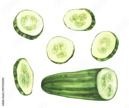 Cucumber set. Fresh whole vegetable and cut sliced cucumber circles. Watercolor hand drawn illustration. Clipart for restaurant, kitchen menu, eco food, nature cosmetic label. Isolated from background