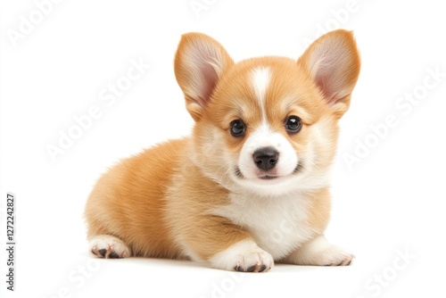 Cuddly corgi puppy resting on a soft surface in a bright setting during the day
