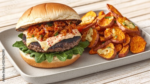 Culinary fusion cuisine food, Juicy Grilled Burger Topped With Caramelized Onions And Melted Cheese