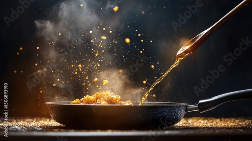 Culinary action in a pan with sizzling ingredients and oil splashing in a dramatic kitchen setting