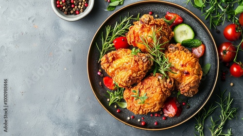 Culinary Artistry: Gourmet Fried Chicken Dish with Fresh Herbs and Seasonal Vegetables on Ad Poster