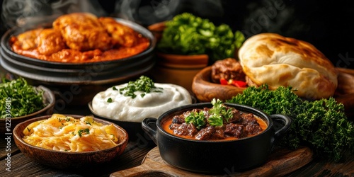 Culinary celebration of ethnic dishes on a wooden table warm lighting rich food culture low angle view
