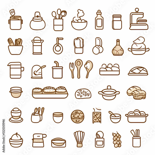Culinary Collection: A comprehensive collection of kitchen utensils, cookware, and ingredients artfully arranged in a stylized illustration.