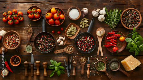 Culinary Ingredients Flat Lay: A top-down view of an assortment of fresh culinary ingredients arranged artistically on a wooden table. Items should include herbs, spices, vegetables, and kitchen utens