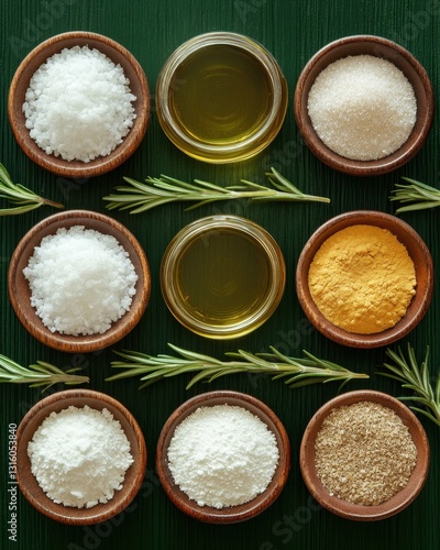 Culinary Still Life of Spices and Herbs in Wooden Bowls on Green Background Overhead View Food Photography