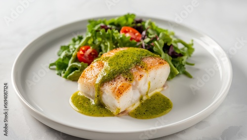 Culinary Still Life. White Fish, Green Sauce, and Fresh Salad on a Plate.