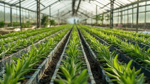 Cultivated Future, Rows of Seedlings in a Modern Greenhouse Nursery