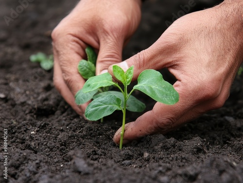Cultivating Hope: Hands Planting Seedling in Nutrient-Rich Soil for Environmental Care and a Promising Future