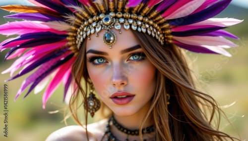 Cultural festival celebration featuring indigenous woman scenic outdoor setting portrait photography vibrant colors