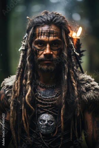 Cultural insight: portrait of a shaman, reflecting authenticity and intimate relationship with nature, spiritual healing, timeless knowledge that embodies shamanic way of life.