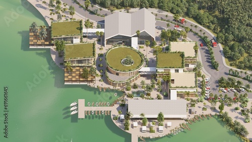 Cultural reinterpretation center, space seen from above, master plan, architectural project plan, Amazon market, artisan market, library, restaurants and auditorium