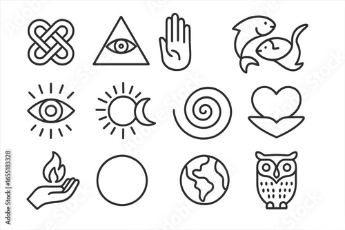 Cultural Ritual Symbols. Line style icons of symbolic elements in cultural rituals: unity knot, sacred triangle, blessing hand