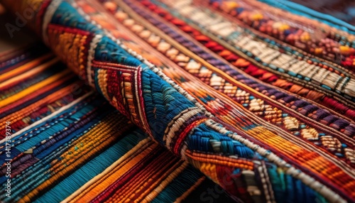 Cultural Tapestry: a close-up shot of a vibrant, intricately woven textile showcases the artistry and tradition of the culture.