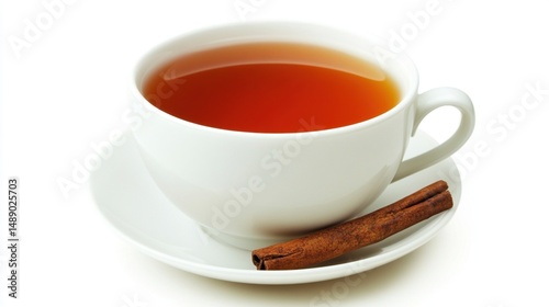 Cup of amber liquid on saucer with cinnamon stick, isolated on a white surface