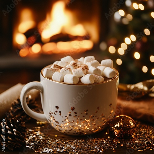 Cup of cocoa with marshmallow in winter Christmas or New Year style cozy picture with fireplace and Christmas tree