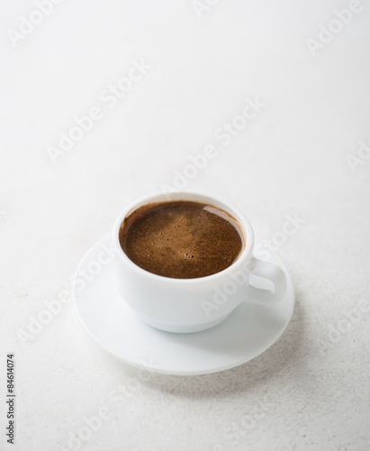 Cup of coffee on old rustic table.