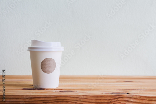 Cup of coffee on wooden table over white wall background