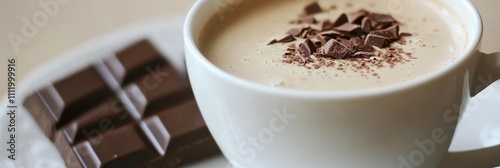 Cup of Coffee with Chocolate Delight - A cozy cup of coffee topped with chocolate shavings, accompanied by rich dark chocolate, perfect for indulgence and relaxation.