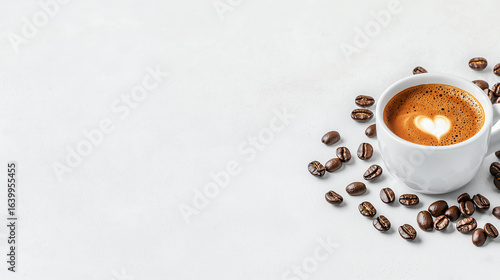 Cup of coffee with heart shaped foam design surrounded by roasted coffee beans, creating warm and inviting atmosphere