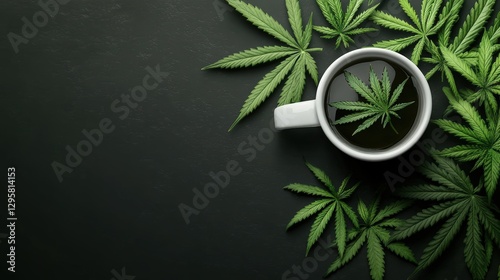 Cup of coffee with marijuana leaves placed beside it on a wooden table for a creative beverage concept