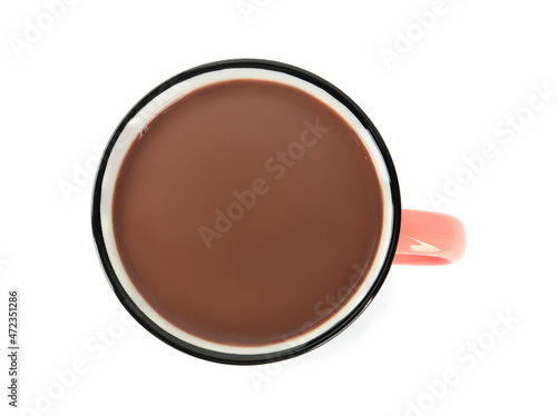 Cup of delicious hot chocolate isolated on white, top view