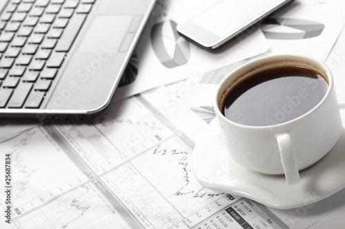 Cup of fragrant coffee on a morning paper business news