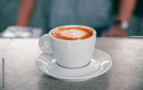 Cup of hot cappuccino coffee on bar counter in cafe