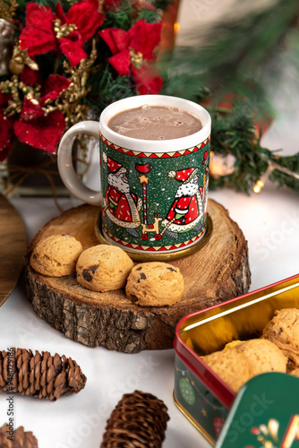 Cup of hot chocolate and cookies on a wooden background with Christmas decorations