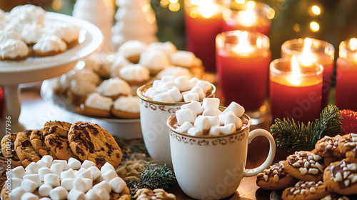 Cup of hot chocolate with marshmallows and cookies on Christmas table