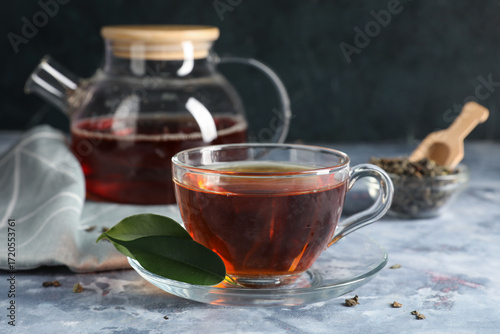 Cup of tasty black tea and green leaves on blue grunge background, closeup