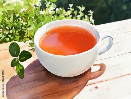Cup of tea on wooden surface, surrounded by greenery, natural light ambiance.