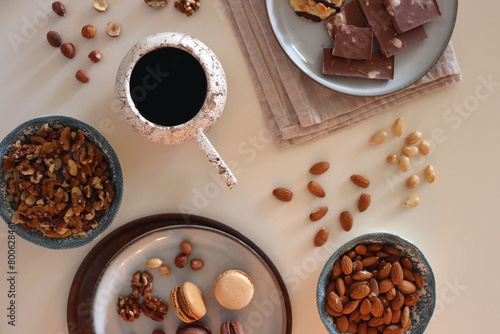 Cup of tea or coffee, cookies, macaroons, chocolate, various nuts and cocoa powder on white background. Top view.