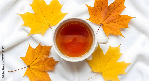 Cup of Tea with Autumn Maple Leaves on White Fabric.