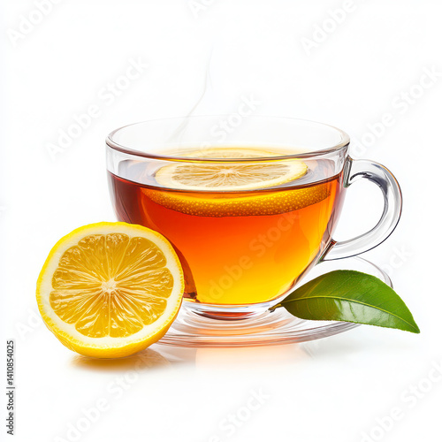 Cup of tea with lemon slice isolated on white background