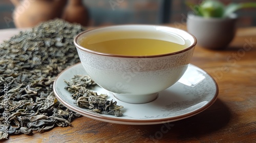 Cup of tea with loose tea leaves on a wooden surface.