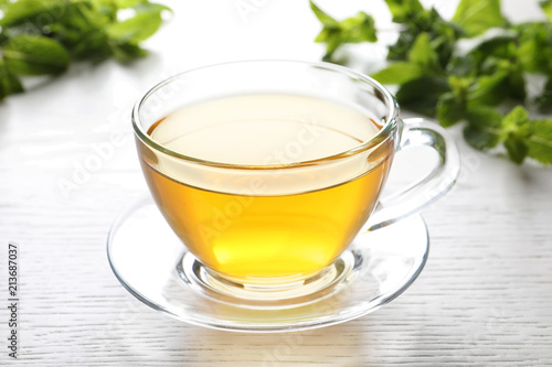 Cup with hot aromatic mint tea on table
