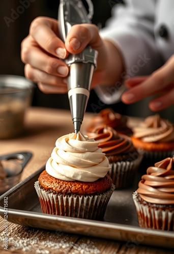 Cupcake decorating, piping bag, swirled frosting, chocolate cupcakes, close-up hands, baking tray, soft focus background, warm tones, kitchen scene, pastry chef skills, detail shot, food photography